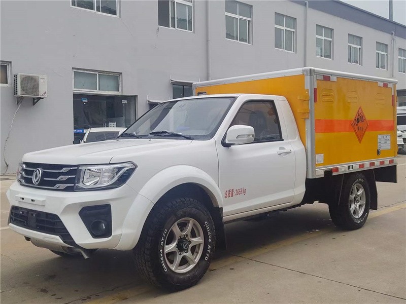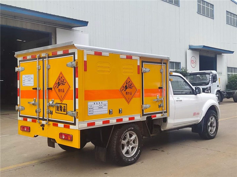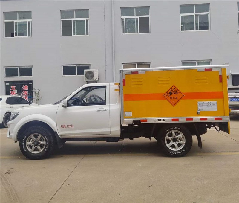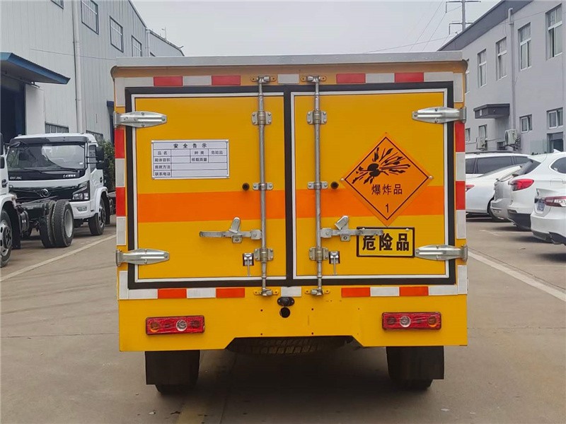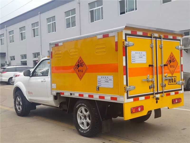 上装配置:厢体尺寸:2160×1390×1200mm,厢体为双层金属结构,外板采用静电屏蔽冷轧钢板,中间填充B1级阻燃泡沫,内饰为导静电性能较好的铝平板。厢体上侧安装防雨通风透气孔。底板为平板,上铺防静电胶皮,厢体右侧前开单侧门,门框带防盗报感应器,顶部带烟雾报感应器。配备随车工具。厢体颜色黄色,两侧及后部橙色反光带,红白相间反射器,“爆炸品”标志牌,危险品牌,安全告示。危险品三角灯,接地静电带,灭火器,防火罩,反光背心,证票齐全。